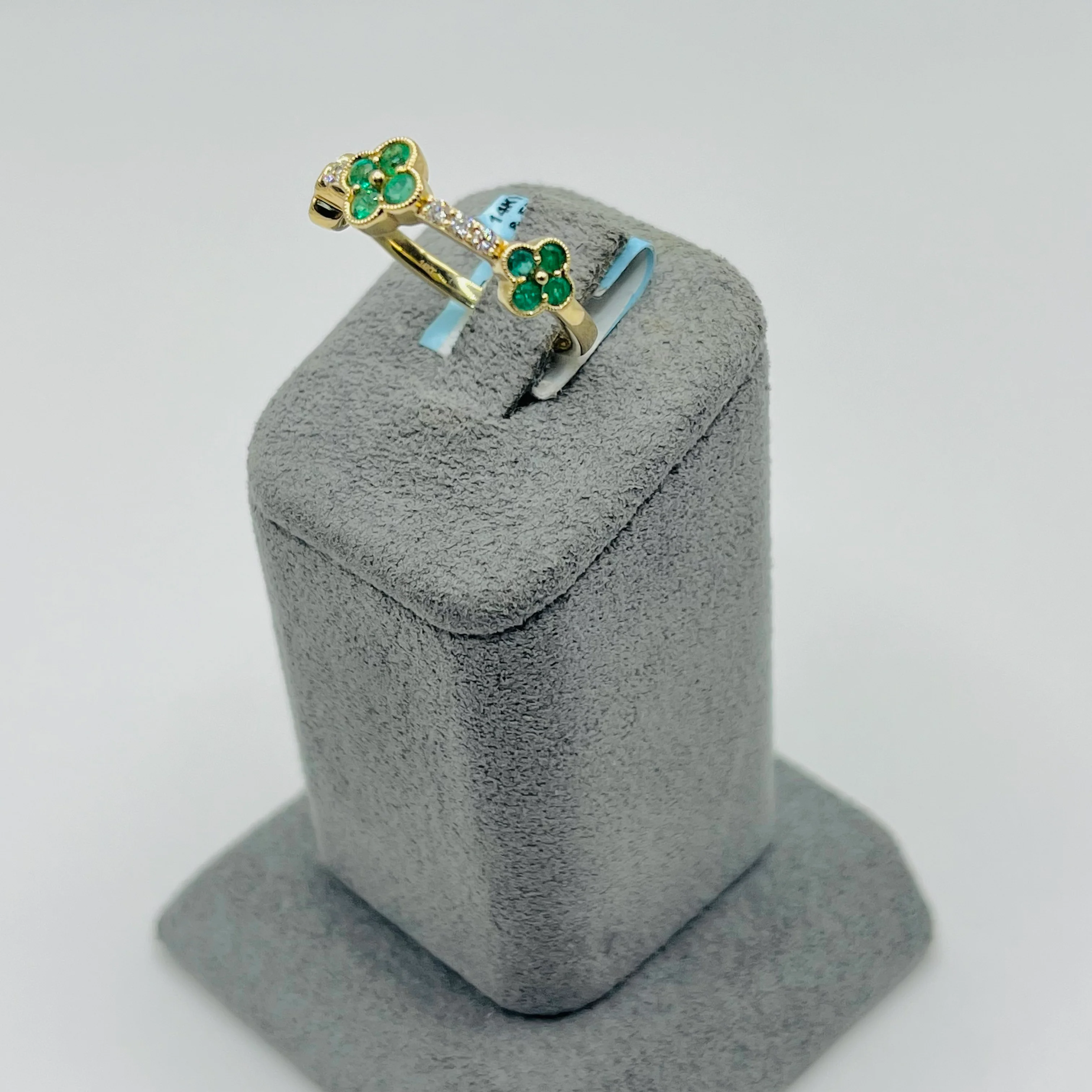Add a touch of elegance to your jewelry collection with this exquisite 14K yellow gold clover ring. Adorned with a dazzling combination of 0.28 carat total weight (ctw) diamonds and 0.23 ctw vibrant emeralds, this ring is designed to impress. The clover motif, symbolizing luck and prosperity, features meticulously set round diamonds and richly colored emeralds creating a striking contrast against the warm glow of yellow gold. Perfect for any occasion, this ring is a timeless piece that embodies luxury and sophistication.