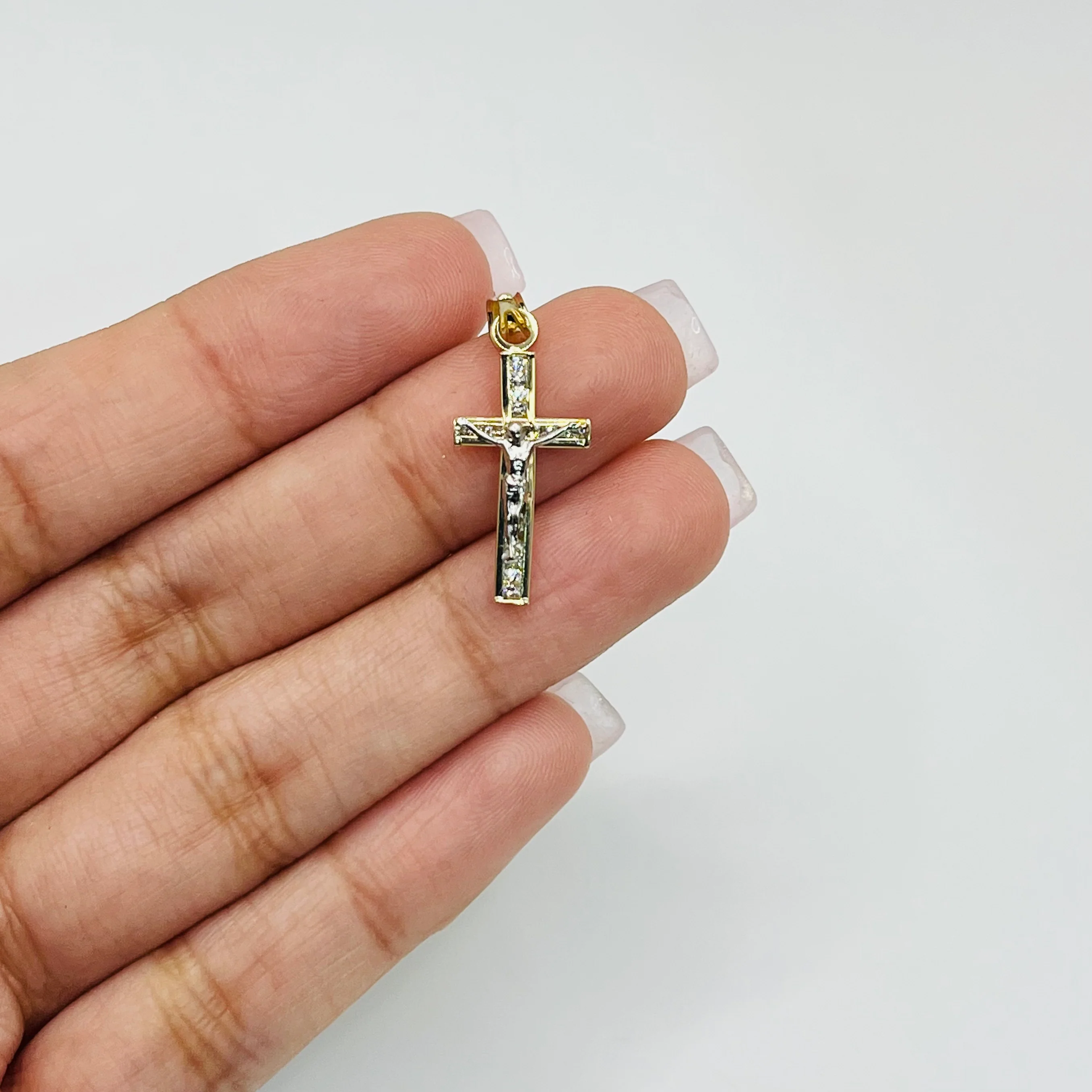 This small Jesus Cross charm with CZ's is crafted in 14K gold, featuring a beautiful classic cross with a row of dazzling CZ's making it a simple classy expression of faith.