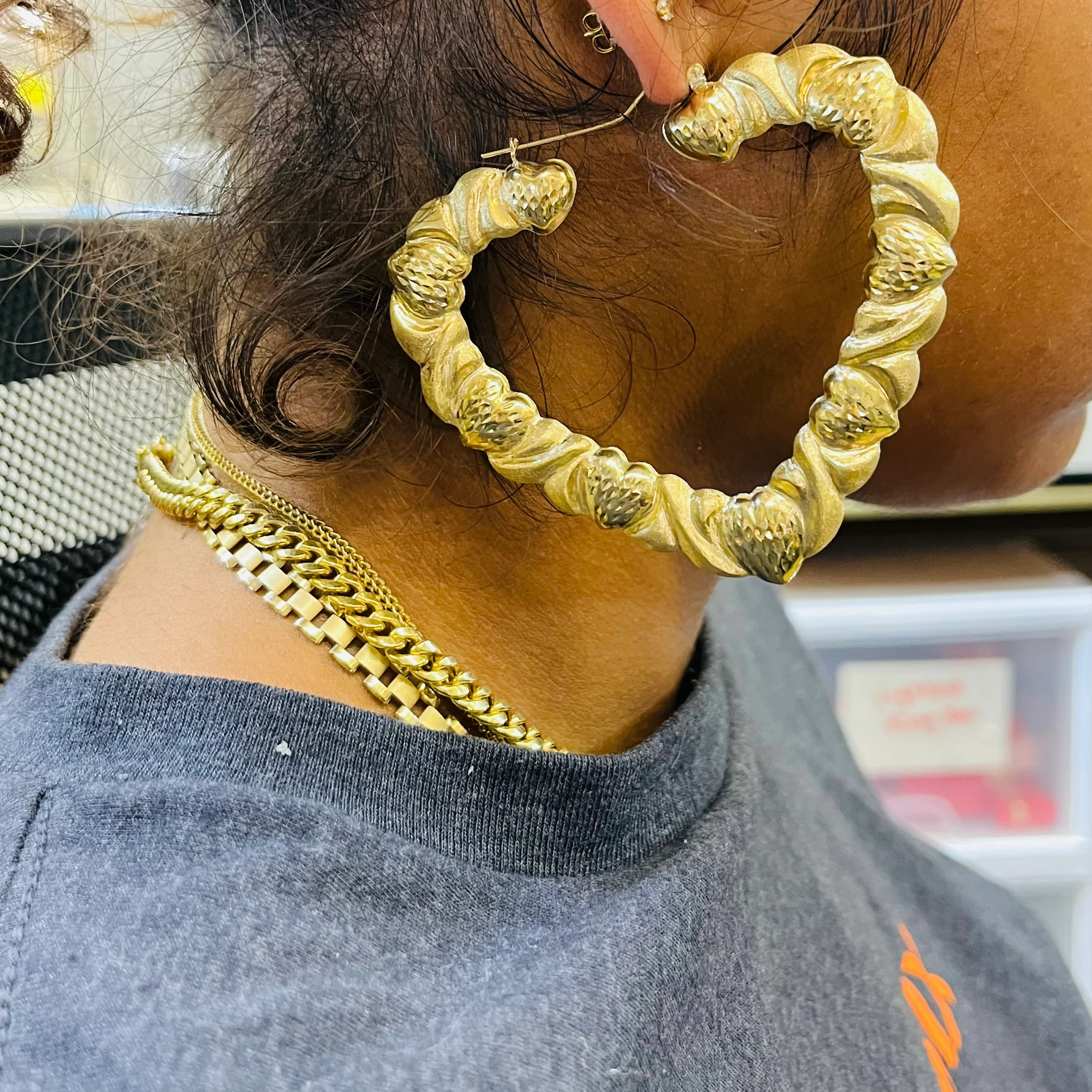10K Gold Hearts Pattern Hoop Earrings (3")